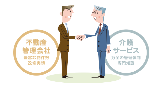 超高齢化社会が到来した現在、特別養護老人ホームの待機人口は数十万人にのぼるといわれ、高齢者の方が「低価格で安心して暮らせる住まい」は圧倒的に不足しております。弊社グループではこれまで主に一般の会社員の方々に対し、アパート・マンション経営による資産づくりのご提案をさせて頂き、供給戸数は47,000戸を超えております。この価値ある資産の空室部分を「高齢者安心サポート付賃貸住宅」として活用し、病院やケアマネジャー、介護事業者、配食業者等と提携した様々なサービスをご提供することで、高齢者にとって「低価格で安心して暮らせる住まい」を提供しております。