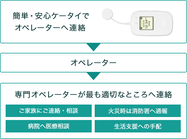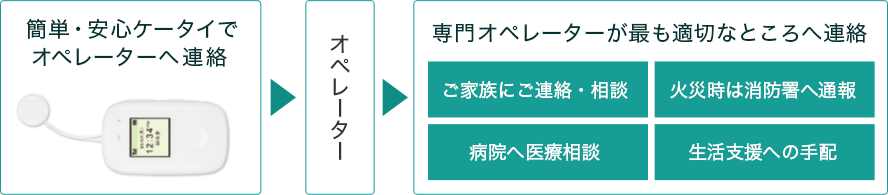 安心サポート付き安心ケータイの見守り機能で、離れて住んでいるご家族も安心。また、もしものときも24時間365日、緊急対応が可能。